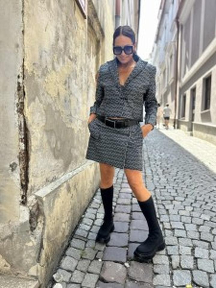 - Dobór długości – zwróć uwagę na to, jak spódnica kończy się na sylwetce.